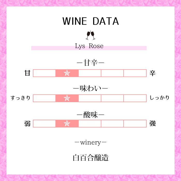 後口には甲州のアクセントが感じられます。とても飲みやすく軽やか。ワインを飲み慣れない方にもおすすめの甘口ロゼワインです。