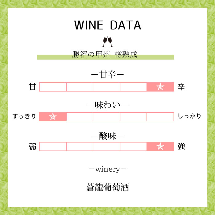 樽の香り、酸味、甲州のもつふくよかさが非常にマッチし、スッキリとした味わいのワインです。