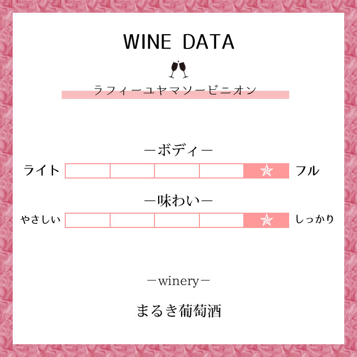 | 品種 | ヤマ・ソービニオン/カベルネソービニョン(山梨県産100%) |