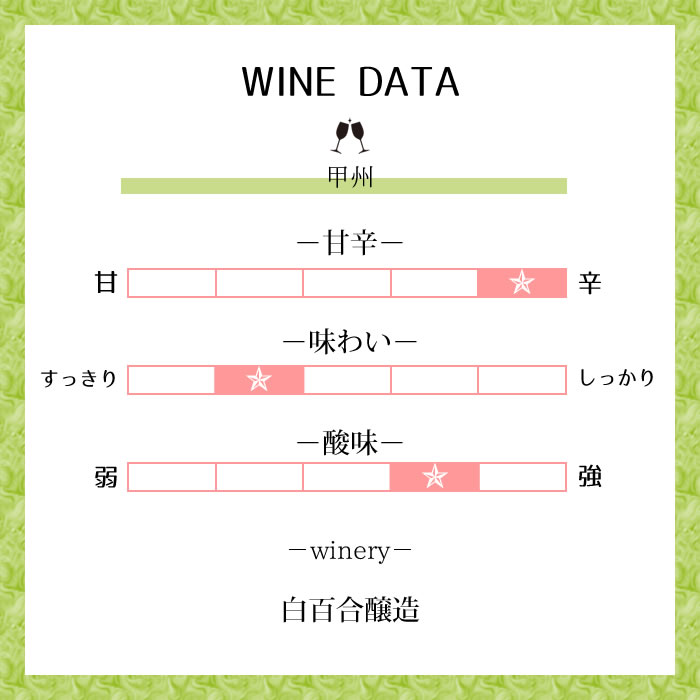 甲州特有の爽やかな柑橘の香りにフレッシュな酸、新酒らしい果実味豊かでフルーティな白ワインです。
